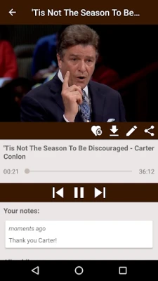 Nekad vairs nepazaudējiet pavedienu – Carter Conlon Sermons katru dienu atgādinās par jūsu pēdējo klausīšanās vietu, ļaujot ar vienu pieskārienu turpināt tieši no tās pašas pozīcijas. Baudiet saturu bez jebkādiem traucējošiem reklāmas paziņojumiem. Lietotne darbojas bez maksas, taču, ja vēlaties atbalstīt tās uzturēšanu un attīstību, John Tibell piedāvā brīvprātīgu abonementu. Sprediķu tēmas aptver plašu jautājumu loku, ieskaitot tuksnesi, baznīcu, ticību, atpūtu un daudz ko citu, sniedzot atbildes uz dažādām dvēseles vajadzībām.